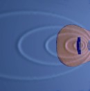 | In reality, the strings approach from the side causing the top to react more like we had skipped a rock across our pool of water. (Astute viewers will know that the ripples on a pool of water will always be circular. We're actually looking at interference patterns which have a much more complex explanation from a physics point of view. The density of the wood, variations in compression ahead of and behind the bridge, lateral stress forces, placement of braces and other factors all contribute to the behavior of these interference patterns. Though not entirely accurate, the water analogy is easy to visualize.) | ![]() |