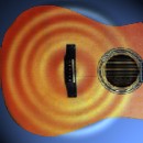 The top of a guitar is made from a thin sheet of flexible wood which is set in motion by the vibrating strings attached to the bridge in the center of the top. |